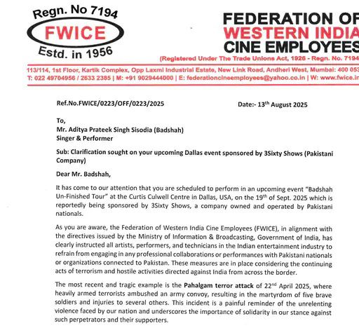 FWICE ਨੇ ਪੱਤਰ ਵਿੱਚ ਲਿਖਿਆ, ਬਾਦਸ਼ਾਹ, ਸਾਨੂੰ ਜਾਣਕਾਰੀ ਮਿਲੀ ਹੈ ਕਿ ਤੁਸੀਂ 19 ਸਤੰਬਰ, 2025 ਨੂੰ ਅਮਰੀਕਾ ਦੇ ਡੱਲਾਸ ਦੇ ਕਰਟਿਸ ਕਲਵੈਲ ਸੈਂਟਰ ਵਿਖੇ ‘ਬਾਦਸ਼ਾਹ ਅਨਫਿਨਿਸ਼ਡ ਟੂਰ’ ਵਿੱਚ ਪ੍ਰਦਰਸ਼ਨ ਕਰਨ ਜਾ ਰਹੇ ਹੋ, ਜਿਸ ਦਾ ਆਯੋਜਨ ਪਾਕਿਸਤਾਨੀ ਨਾਗਰਿਕਾਂ ਦੀ ਮਲਕੀਅਤ ਅਤੇ ਸੰਚਾਲਨ ਵਾਲੀ ਕੰਪਨੀ 3Sixty Shows ਦੁਆਰਾ ਕੀਤਾ ਜਾ ਰਿਹਾ ਹੈ।