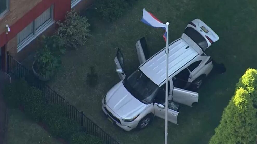 ਇੱਕ ਹੈਲੀਕਾਪਟਰ ਤੋਂ ਪ੍ਰਾਪਤ ਨੌਂ ‘ਤੇ ਫੁਟੇਜ ਵਿੱਚ ਇੱਕ ਚਿੱਟੀ SUV ਦਿਖਾਈ ਦਿੰਦੀ ਹੈ ਜਿਸਦੇ ਦਰਵਾਜ਼ੇ ਖੁੱਲ੍ਹੇ ਹਨ ਅਤੇ ਇੱਕ ਝੰਡੇ ਦੇ ਨੇੜੇ ਸਾਹਮਣੇ ਖਿੜਕੀਆਂ ਟੁੱਟੀਆਂ ਹੋਈਆਂ ਦਿਖਾਈ ਦੇ ਰਹੀ ਹੈ।