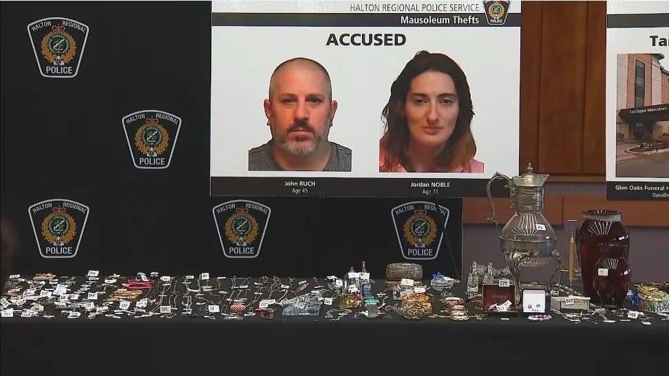 ਹਾਲਟਨ ਰੀਜਨਲ ਰੀਜਨਲ ਪੁਲਿਸ ਵੱਲੋਂ GTA ਵਿਖੇ ਕਈ ਕਬਰਾਂ ਅਤੇ ਮਕਬਰਿਆਂ ਚੋਂ ਲਾਸ਼ਾਂ ਦੇ ਗਹਿਣੇ ਅਤੇ ਕੀਮਤੀ ਸਾਮਾਨ ਚੋਰੀ ਕਰਨ ਦੇ ਦੋਸ਼ਾਂ ਹੇਠ ਦੋ ਜਣਿਆਂ ਨੂੰ ਗ੍ਰਿਫਤਾਰ ਅਤੇ ਚਾਰਜ ਕੀਤਾ ਗਿਆ ਹੈ। ਗ੍ਰਿਫਤਾਰ ਹੋਣ ਵਾਲਿਆਂ ਦੀ ਪਛਾਣ ਜੌਨ ਰੁਚ (45) ਅਤੇ ਜਾਰਡਨ ਨੋਬਲ (32) ਵਜੋਂ ਹੋਈ ਹੈ। ਮੌਜ਼ੋਲੇਮਾਂ ਅਤੇ ਕਬਰਿਸਤਾਨਾਂ ‘ਚ ਲਗਭਗ 300 ਤੋਂ ਵੱਧ ਚੋਰੀ ਦੀਆਂ ਘਟਨਾਵਾਂ ਹੋਈਆਂ ਸਨ। ਦੋਸ਼ੀਆਂ ਵੱਲੋਂ ਇਹ ਵਾਰਦਾਤਾਂ ਦਿਨ ਦੇ ਸਮੇਂ ਕੀਤੀਆਂ ਜਾਂਦੀਆਂ ਸਨ ਅਤੇ ਉਹ ਅਕਸਰ ਖੁਦ ਨੂੰ ਮ੍ਰਿਤਕਾ ਦੇ ਰਿਸ਼ਤੇਦਾਰ ਦੱਸ ਉੱਥੇ ਜਾਂਦੇ ਸਨ। ਪੁਲਿਸ ਵੱਲੋਂ ਵੱਡੀ ਪੱਧਰ ਤੇ ਚੋਰੀ ਕੀਤਾ ਗਿਆ ਸਾਮਾਨ ਵੀ ਬਰਾਮਦ ਕੀਤਾ ਗਿਆ ਹੈ ਅਤੇ ਕਿਹਾ ਗਿਆ ਹੈ ਕਿ ਜੇਕਰ ਕਿਸੇ ਪਰਿਵਾਰ ਨੂੰ ਲੱਗਦਾ ਹੈ ਕਿ ਉਹ ਵੀ ਇਸ ਚੋਰੀ ਦੀਆਂ ਘਟਨਾਵਾਂ ਤੋਂ ਪ੍ਰਭਾਵਿਤ ਹਨ ਤਾਂ ਉਹ ਉਨ੍ਹਾਂ ਨਾਲ ਸੰਪਰਕ